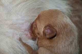 Sie ist auch schon völlig realxed... außer ein anderer Hund ist mit im Raum. Dann wird noch akribisch drauf geachtet, dass nieand in die Wurfbox schaut... ;)